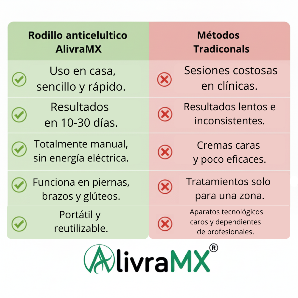 ‘’El rodillo anticelulítico de AlivraMX es la forma más sencilla y eficaz de suavizar la celulitis, reducir medidas y tonificar la piel, ¡directamente en tu casa!’’.